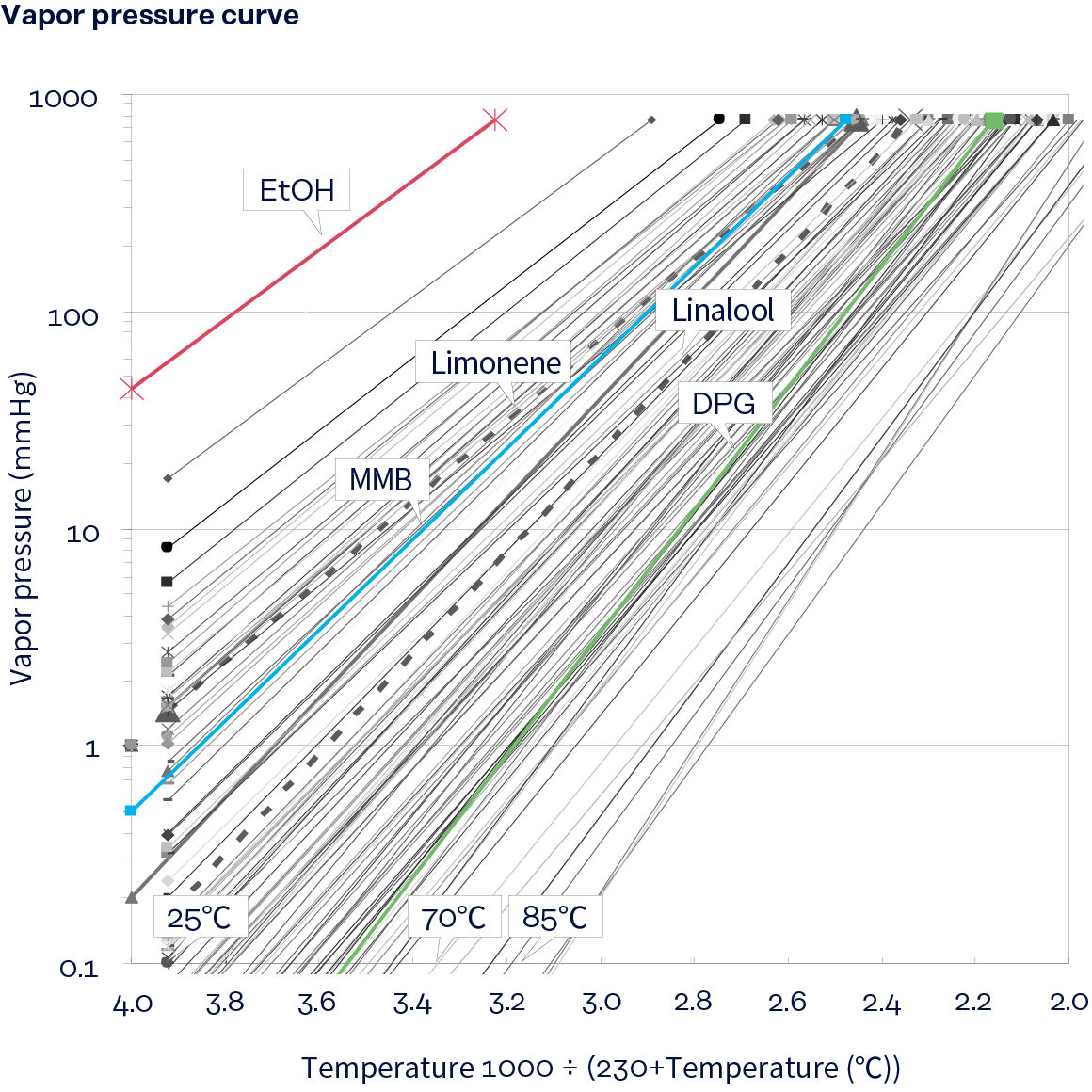 The vapor pressure of aroma chemicals and solvents was plotted.